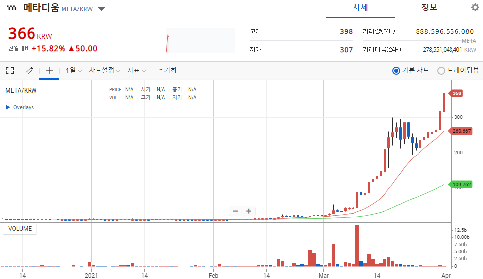 21년 3월 31일 현재, 최고점을 갱신하고 있으며, 오늘 원화 400원의 고점을 찍었습니다. 전체적으로 우상향인 차트를 보여주고 있으며, 근래에 이르러 다소 거래량이 주춤하는 모습을 보이긴하지만, 거래량과 상관없이 가격은 전반적인 상승을 보여줍니다.