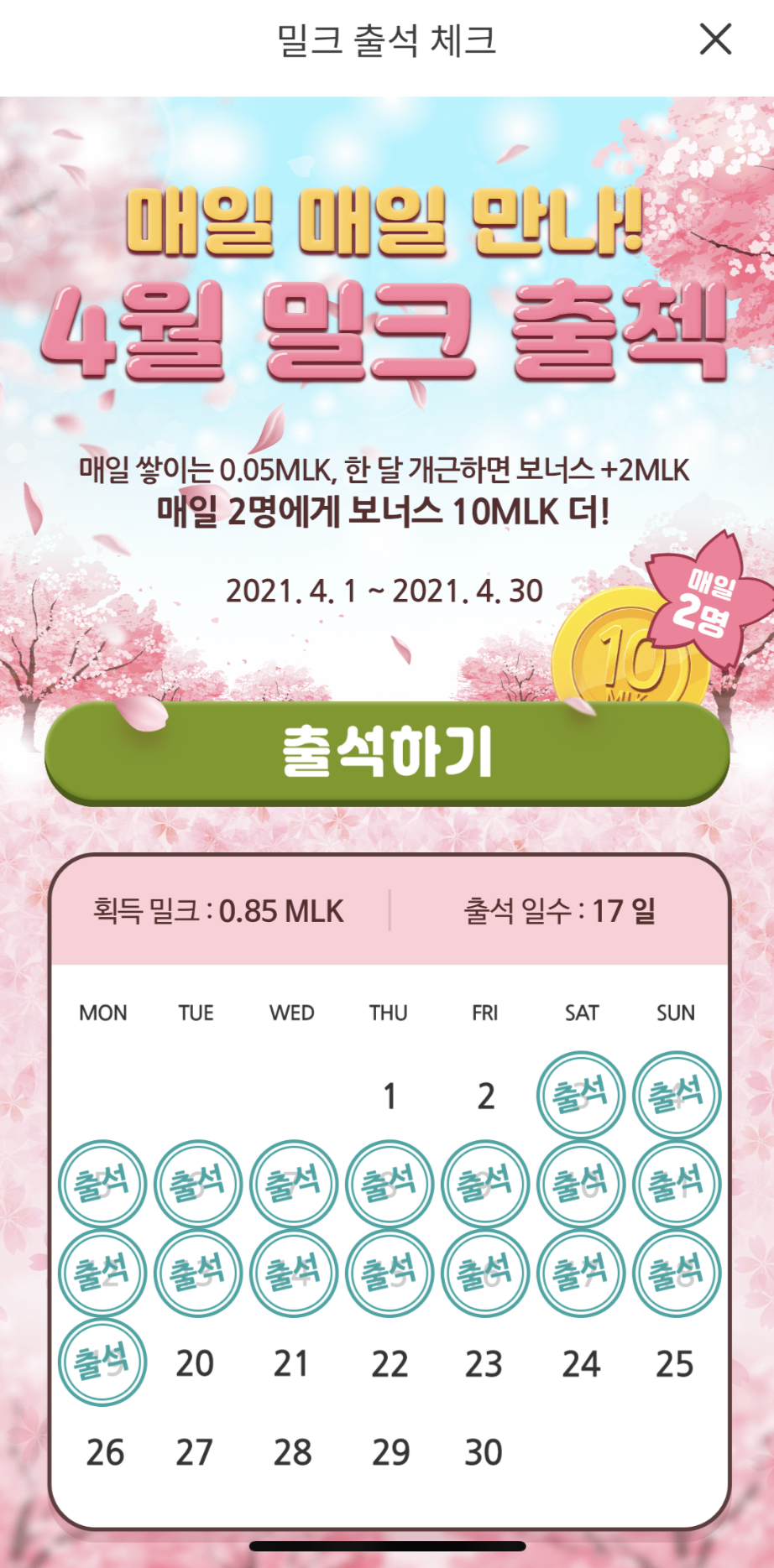매일 매일 접속하여 출석체크를 진행하면, 0.05MLK ( 약 120 원) 정도를 획득할 수 있습니다. 클릭 한방에 120원 정도라면 앱테크 측면에서 나름 쏠쏠하구요. 한 달 개근을 하면 2MLK 를 추가로 주니, 한달에 약 8400원 가량의 수익을 얻을 수 있습니다.