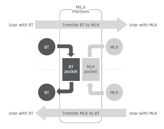 여기서 중요한 단어하나가 등장합니다. 바로 "BT (Brand Token)" 입니다. BT (브랜드 토큰) 과, 밀크 와의 두가지 형태의 토큰 시스템을 구축하여, 해당 토큰을 Mil.k Platform 위에서 상호 교환을 이루겠다라는 뜻입니다.