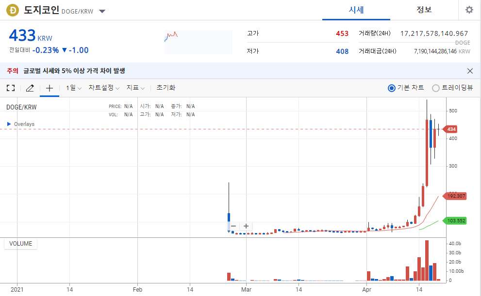 일주일 전 (4월 13일) 부터 급격한 상승을 하면서, 약 4배를 상승을 이루는데 단 일주일만 소요되는 근래의 가장 한한 코인입니다.