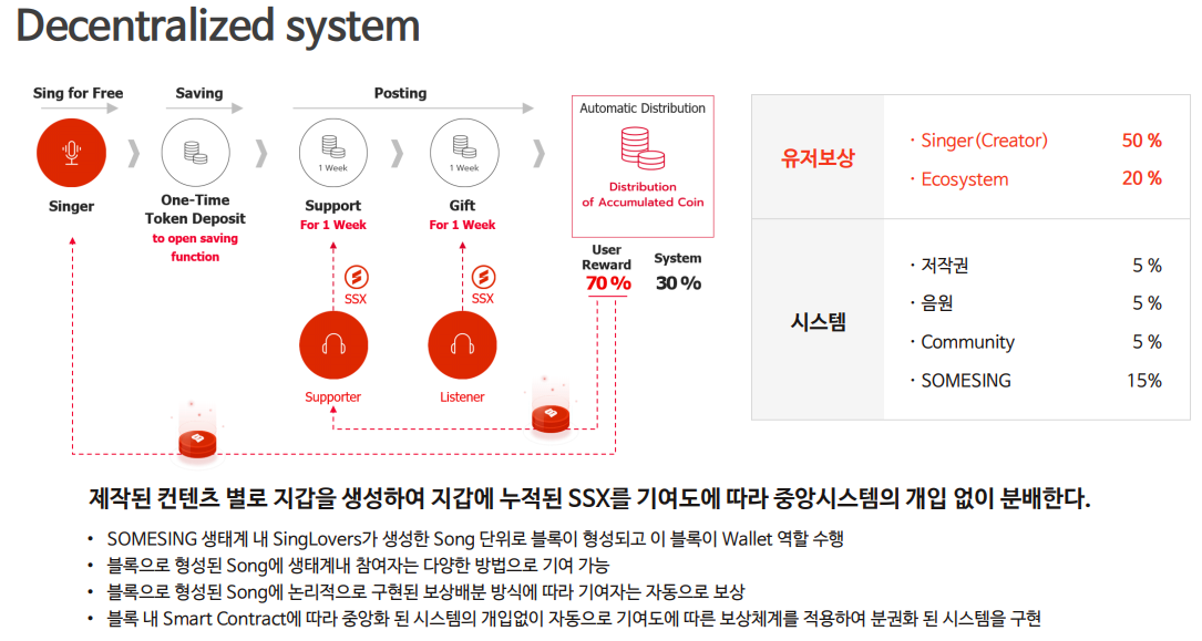 탈중앙화 시스템을 이용하여, 싱어가 노래를 부르면, 중앙시스템 개입없이, SSX를 분배하고, 또 이를 Eco System 으로 분산시킴으로 인하여 생태계를 구성하고 있습니다.