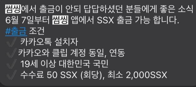 입니다. 썸씽 앱은 그동안 출석체크, 후원하기 등으로 SSX를 이용자들에게 리워드 형태로 보상을 지속적으로 했었는데요. 이때까지 그 발행된 SSX를 앱에서 출금을 하지 못하여, 거의 뭐 무용지물인 상태로 남아있었습니다.
