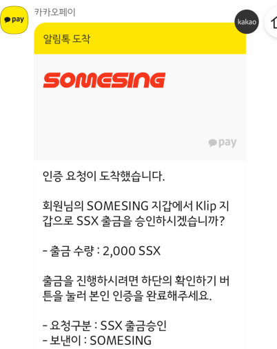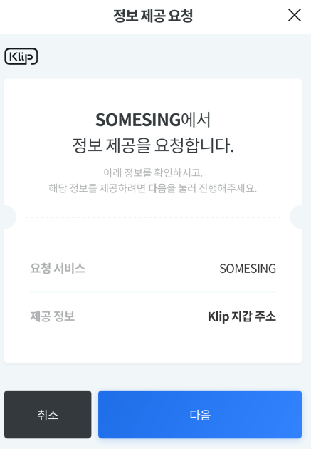 SSX는 KLay (클레이튼) 기반이고, 카카오톡 클립은 KLAY 주소를 공통적으로 사용하게 때문에, KLIP 내에 SSX 주소와 KLAY 주소가 다르지 않습니다. SOMESING 앱으로 주소를 넘겨주기 위해서 동의를 진행합니다.