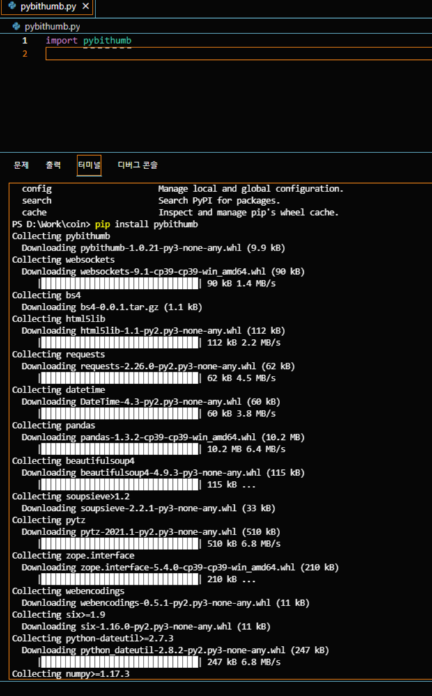 혹옥시나, 파이썬 모듈 설치를 방법을 모르신다면, VS CODE 터미널 상에서, pip install pybithumb 만 입력하시면 뾰로롱 설치가 됩니다.