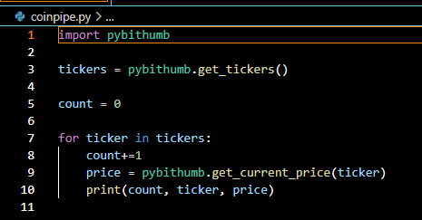 사용되는 함수는 get_ticker() (현재 거래되고 있는 가상화폐의 목록을 리스트 형태로 하나씩 표시),