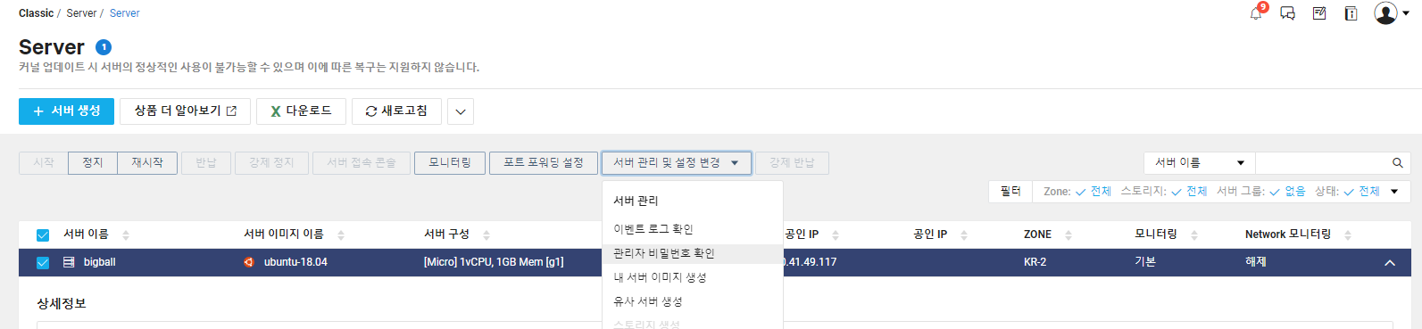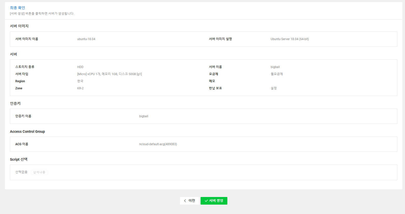 OS 는 우분투 18.04를 선택했고, 위와 같이 차근차근하면 서버가 생성이 됩니다.