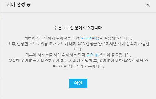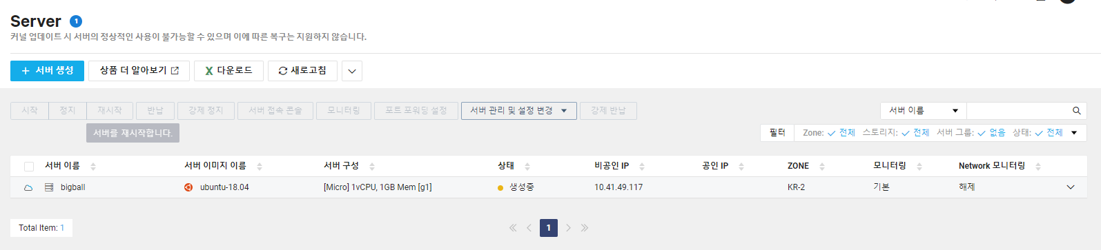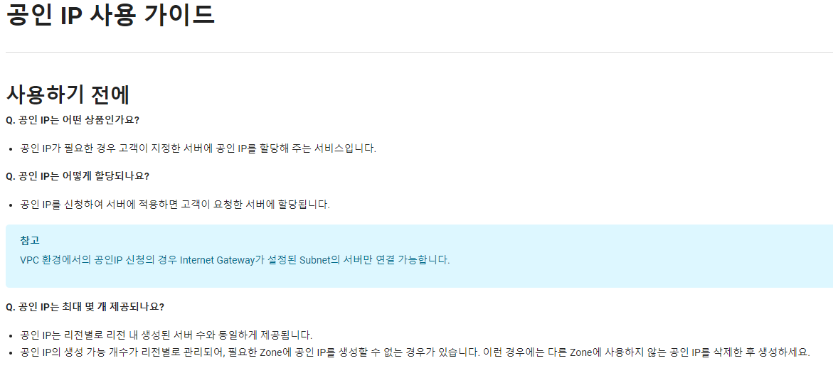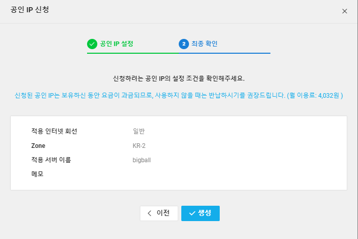 서버에 용도에 따라 다르겠지만, 외부로 서비스가 제공되기 위해서는 공인 IP 설정이 필요합니다. 일단 저 같은 경우에는 필요가 없다고 생각되어 패스 했습니다. ( 비용이 월 4032원... )