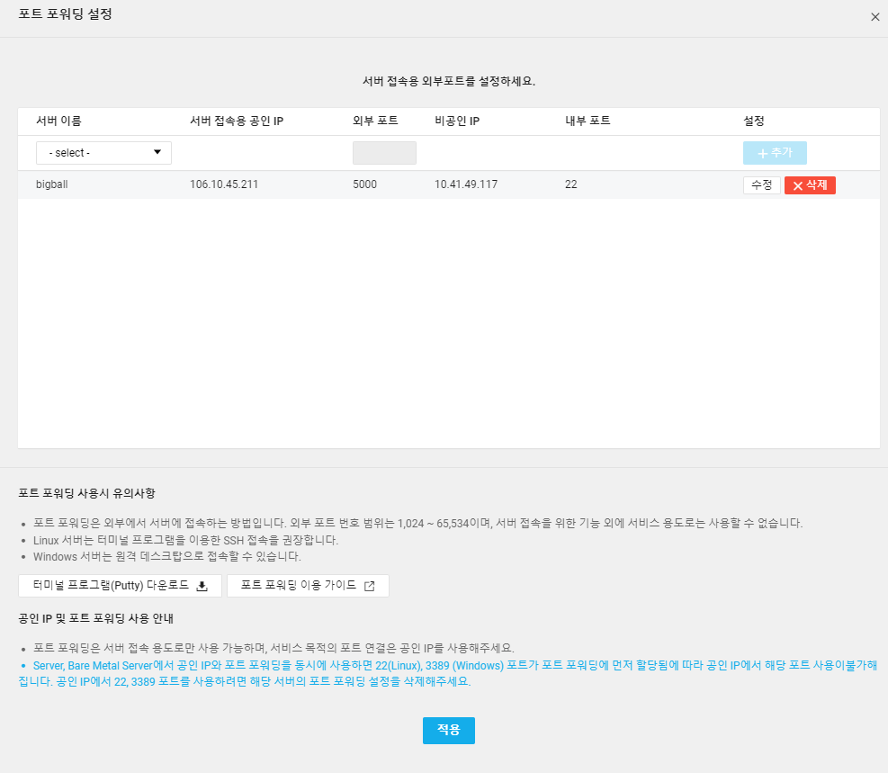 따라서, 기존에 사용하는 22, 3389 포트를 그대로 사용할 수 없으며, 신규로 만든 외부 포트를 통해서 마치 22 포트를 사용하듯하여 사용이 가능합니다.