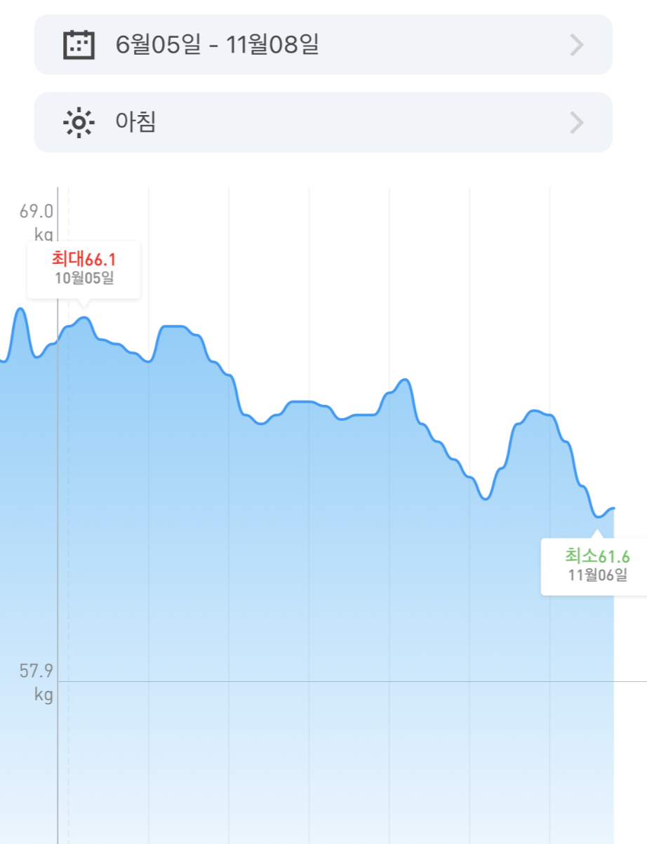 시작 1주차에서 67 Kg -> 61.6 Kg 으로 6주에 5.4Kg를 감량을 하였네요.