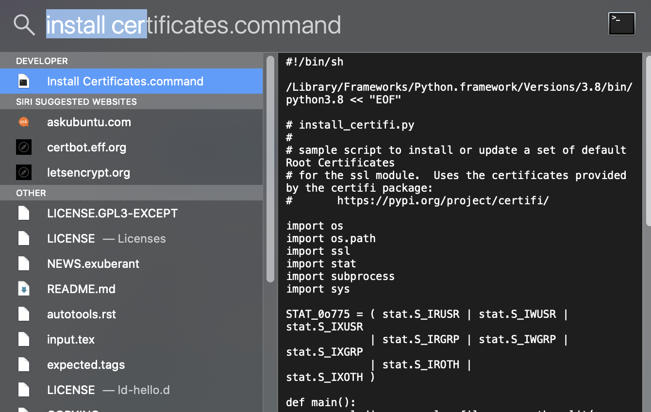 간단하게 Command + Space 로 Install Certificates.command 를 찾고, 이를 더블클릭으로 실행해주면 됩니다.