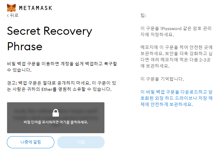 . 해당 암호는 Metamask 사용 시에, 로그인 할 때 사용됩니다.