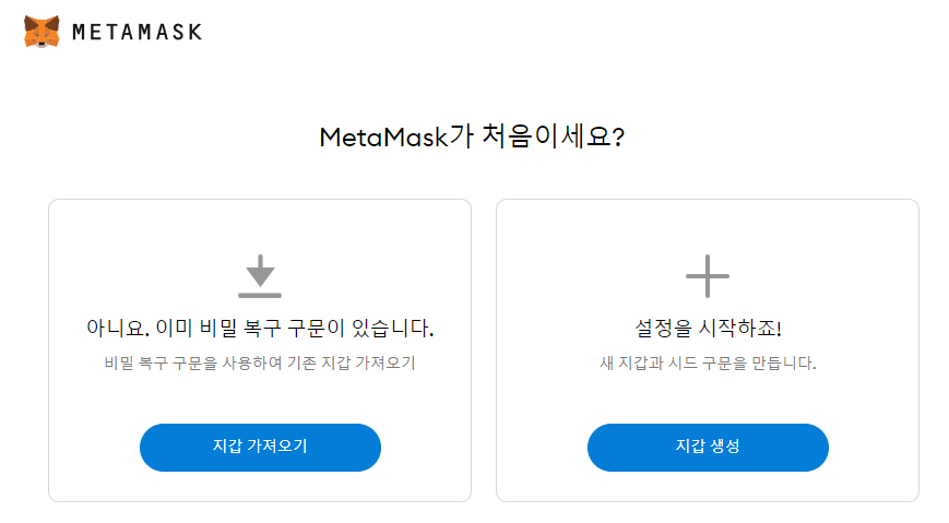 . 기존에 metamask 지갑을 만들어보지 않았기 때문에, 지갑 생성을 선택합니다.