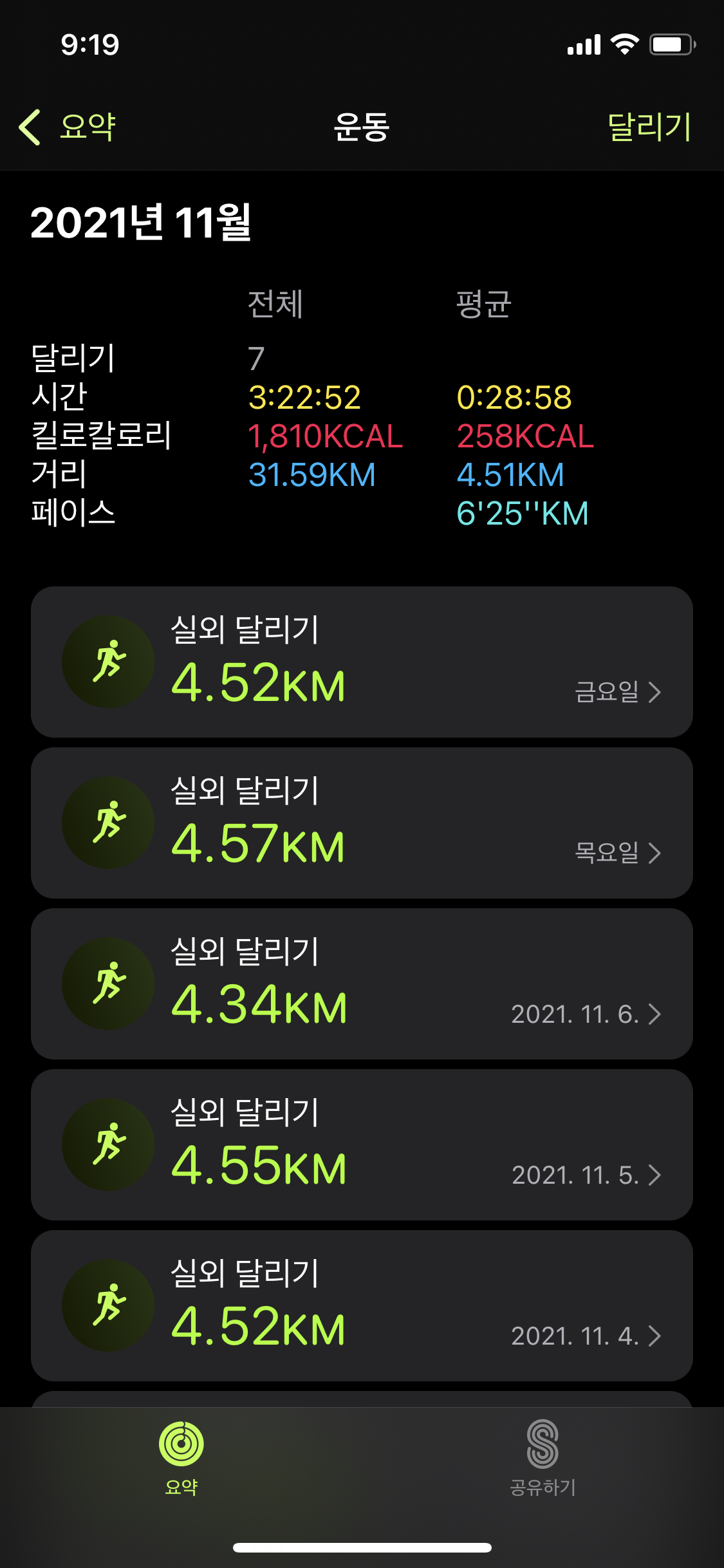 운동 : 달리기 4.52 Km ( 평균 속도 6'22''/km, 구간 최고 6'19''/km )