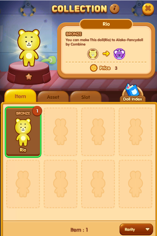 위에서 쿠키를 이용해서 랜덤하게 떨어지는 인형(리오)을 획득했습니다. 이 리오는 다시 쿠키로 팔수도 있고, 일정 일형과 합치면 다른 인형이 생깁니다. 이런식으로 인형을 교배(?) 해서 새로운 인형을 만들게 됩니다.