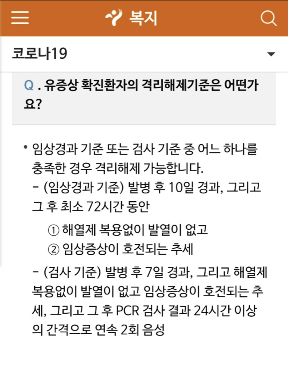 - 확진자 격리 기간은 사람에 따라 다르며, 보통 확진일로부터 10일 이다.