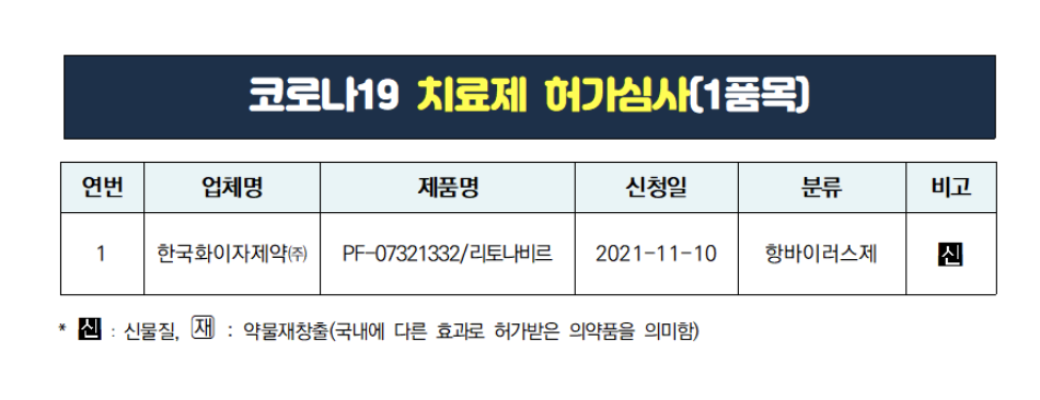 현재 국내에서는 화이자의 "리토나비르"가 코로나19 치료세 허가 심사를 앞두고 있는 상황입니다.