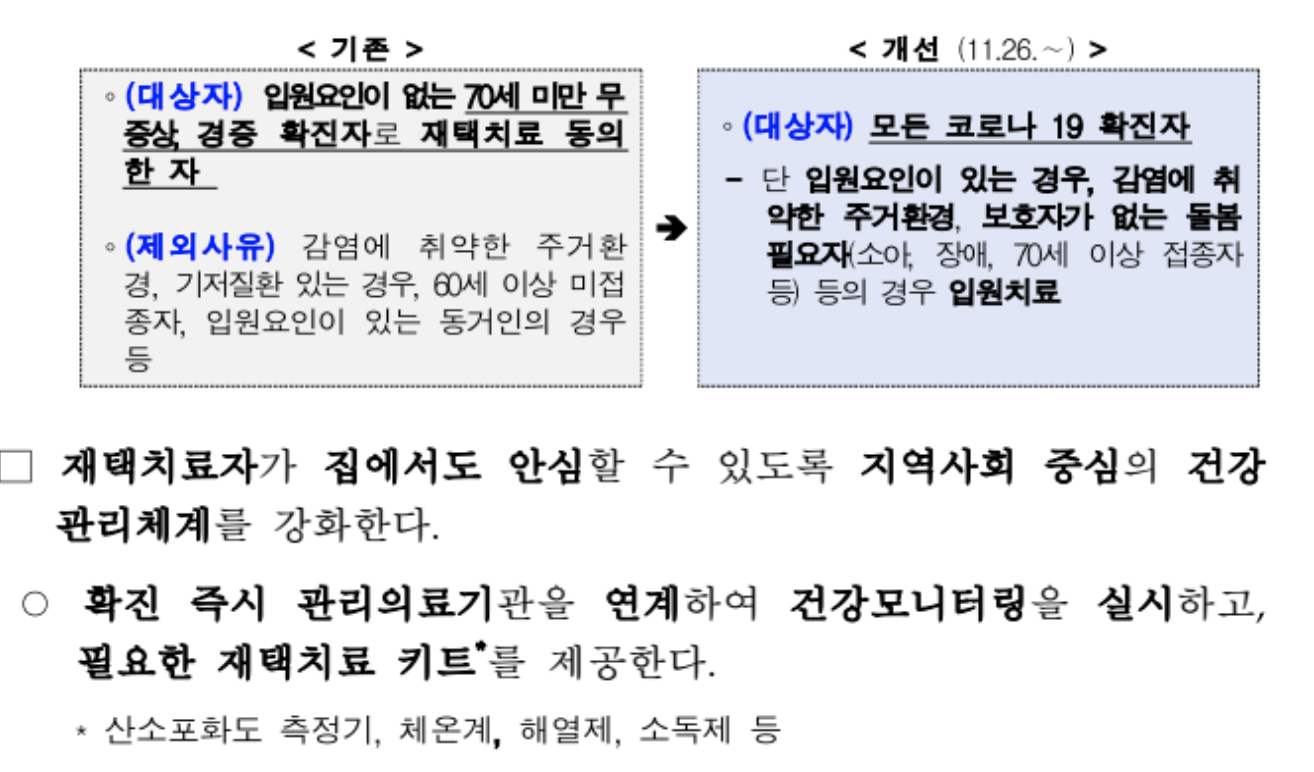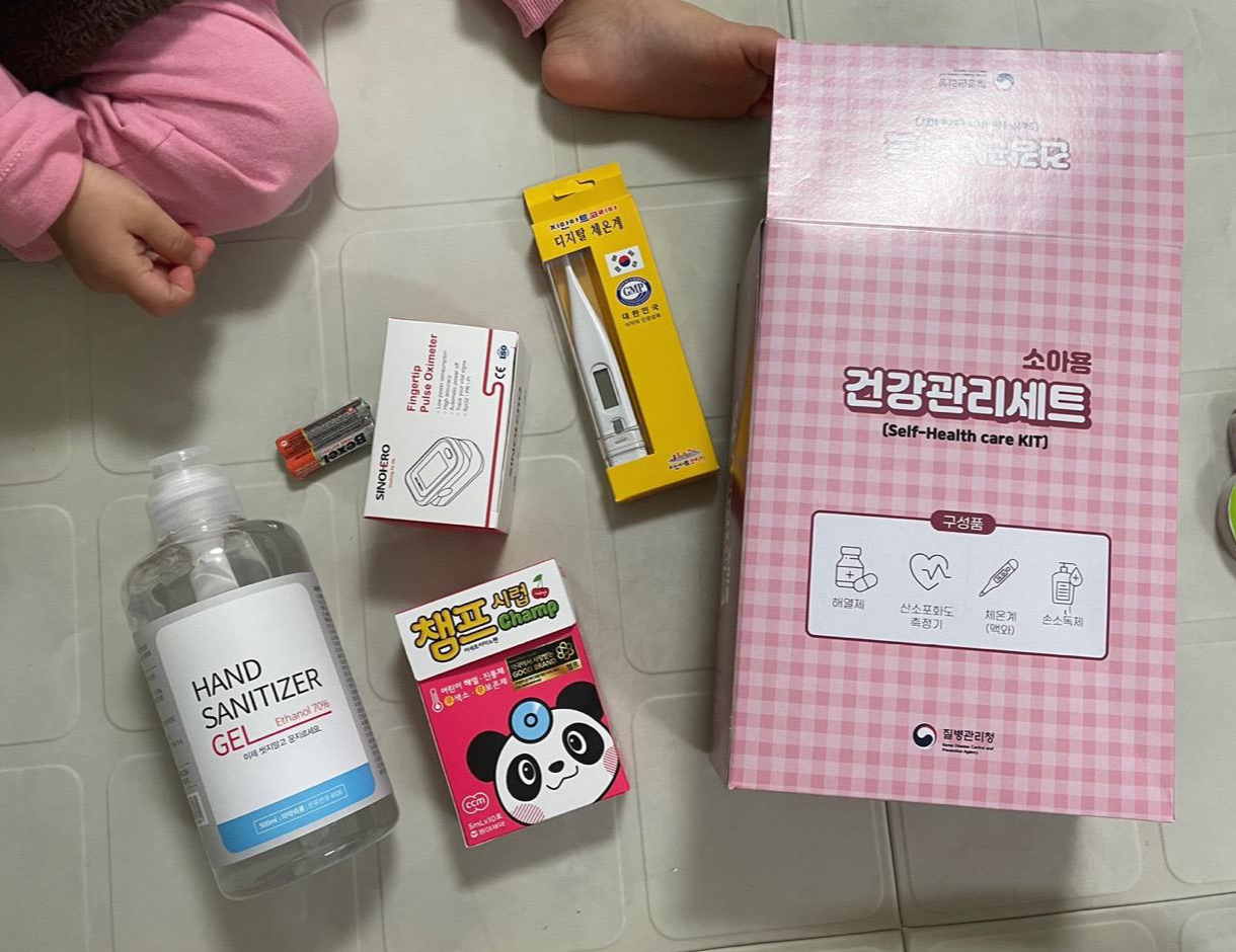 - "재택치료" 시에 재택치료키트 (산소포화도측정기, 체온계, 해열제, 소독제)가 제공된다.