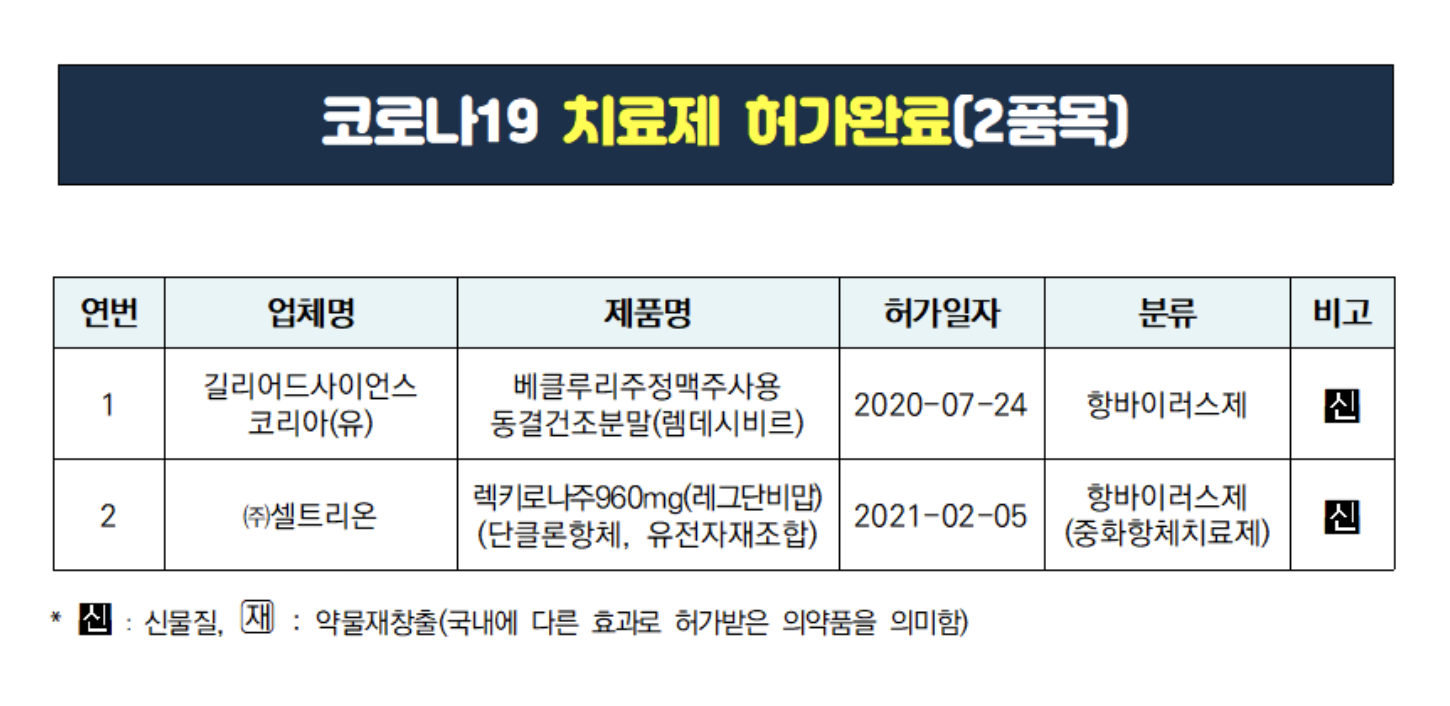 현재 국내에 치료제로 허가완료된 품목은 아래 2품목 입니다. "베클루리주" 정맥 주사용, "렉키로나주" 두가지 치료제 모두 주사제 형태로 되어 있어서, 위중증환자에게만 허가되어 사용되고 있습니다.
