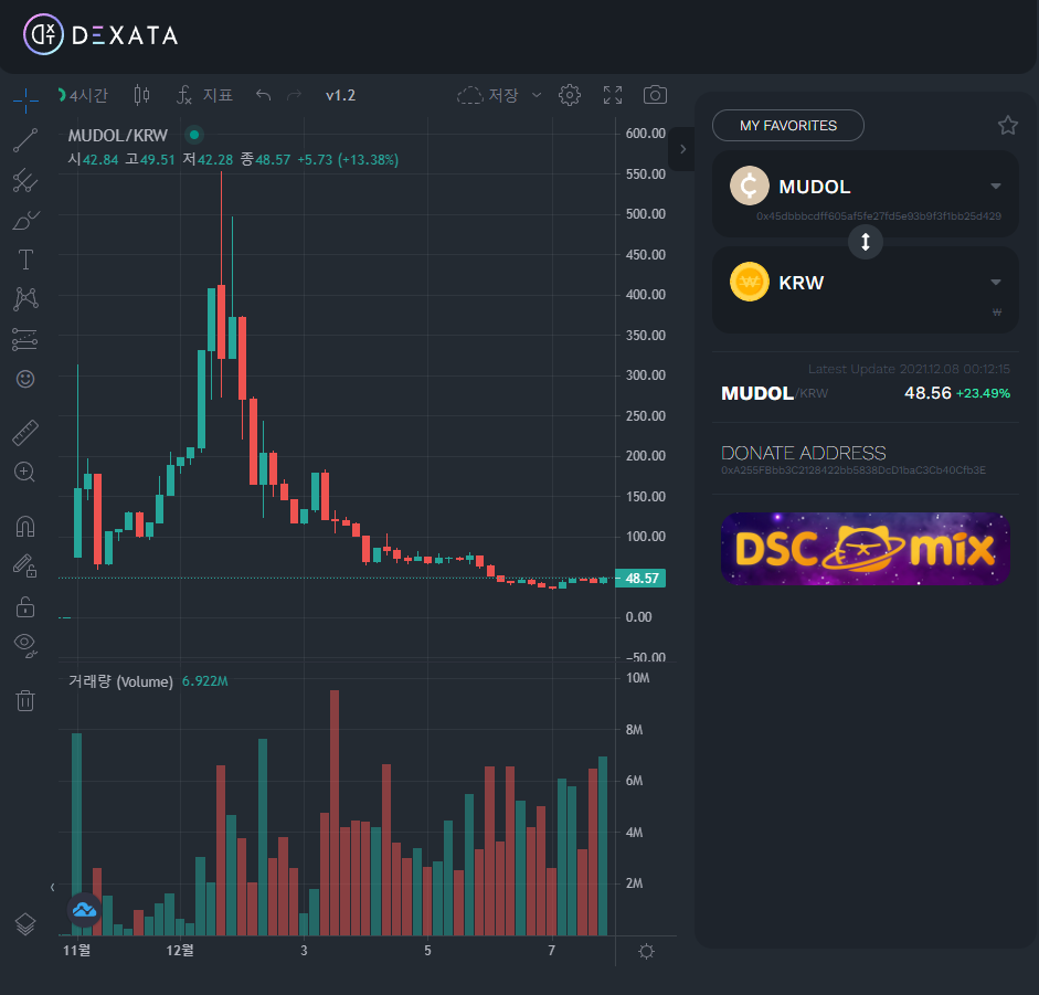 아래 경로를 통해서 바로 MUDOl - KRW 으로 차트 확인이 가능합니다. 위 글을 쓸 때는 거의 최고 점인 500원 정도 했는데요. 현재는 48원을 거의 10배가 하락했습니다.