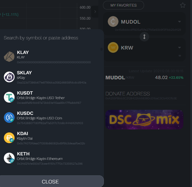MY Facvorites 에서 보고 싶은 토큰을 선택하고, 아래에서 환전 할 토큰을 선택하면, 해당 토큰을 PAIR 로 한 가격 차트를 확인 할 수 있습니다.