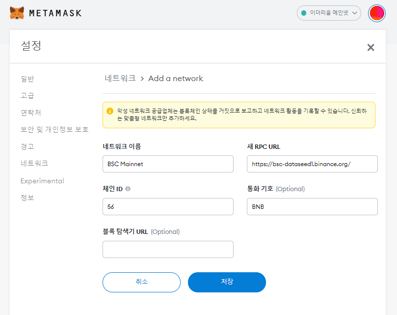 네트워크 추가(Add Network)를 클릭하고 수동으로 바이낸스 스마트 체인을 추가합니다. 각 네트워크를 위해 입력해야 하는 값은 아래와 같습니다.