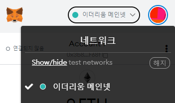처음에 메타마스크를 설치를 하면, 이더리움 메인넷이 기본으로 연동이 됩니다. 이는 현재 바이낸스 스마트 체인 디앱에서 사용할 수 없습니다.