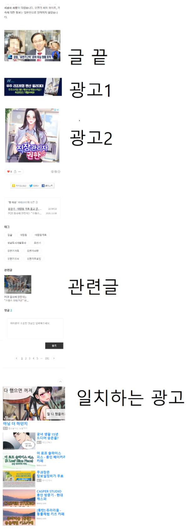 현재 구조는 글이 종료되고, 하단 광고가 2개 (애드핏, 애드센스) 실리며, 카테고리의 다른글 -> 태그 -> 관련글 -> 댓글 -> 일치하는 광고 순으로 기재 되고 있습니다.