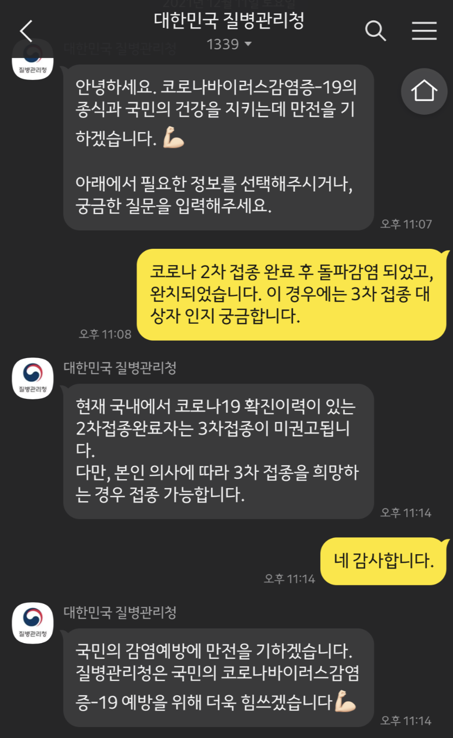 검색을 해보니, 실제로 완치자 중에서 맞은 사람도 있고, 맞으라고 연락을 온 사람도 있더군요. 좀 더 정확하게 하기위해서 이 포스팅을 위해서 질병관리청 카카오톡으로 문의를 남겨보았습니다.