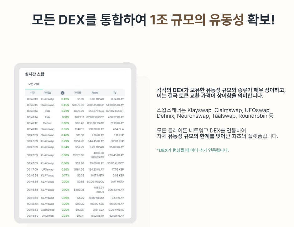 "스왑 스캐너" 는 자체적으로 유동성 풀을 만들어서 확보하는 대신에, 타 DEX를 연동해서 타 DEX의 유동성 풀 까지 자신의 유동성으로 끌어 모았습니다. 그래서 현재 1조원의 유동성을 확보하고 있다고 말하고 있습니다.