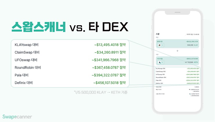 스왑스캐너는 클레이튼 기반 최저가 토큰 구매를 보장하는 차세대 "DEX aggregator" 입니다. Klayswap, UFOswap, Pala,Claimswap,Definix,Roundrobin,Taalswap 등 클레이튼 기반 모든 DEX를 연동하여 1조 규모의 유동성을 확보하고, 자체 엔진 navigator를 통해 토큰을 분할 라우팅하여 타 DEX 대비 항상 저렴한 교환 가격을 제공합니다.