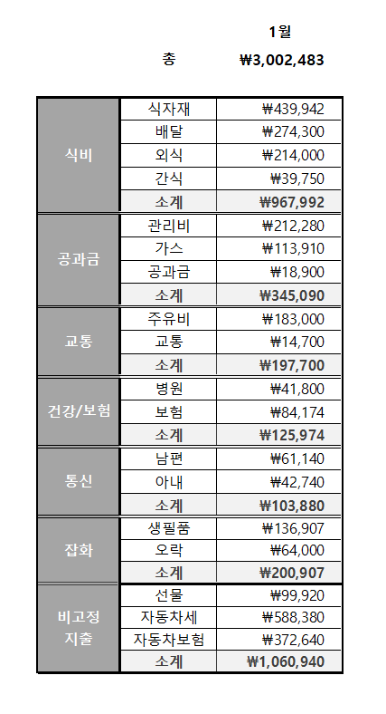 요즘 블로그 글쓰기를 뜸하게 해서, 다시 마음을 다잡고 2023년 부터 쓰고 싶은 것만 써보기 해보고자합니다. 첫 게시물은 2023년 3인가구 1월 가계부 입니다.