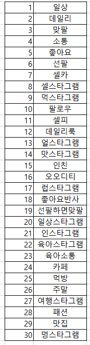 노가다를 해서 아래와 같이 한글 해시태그 순위를 추려 보았다.