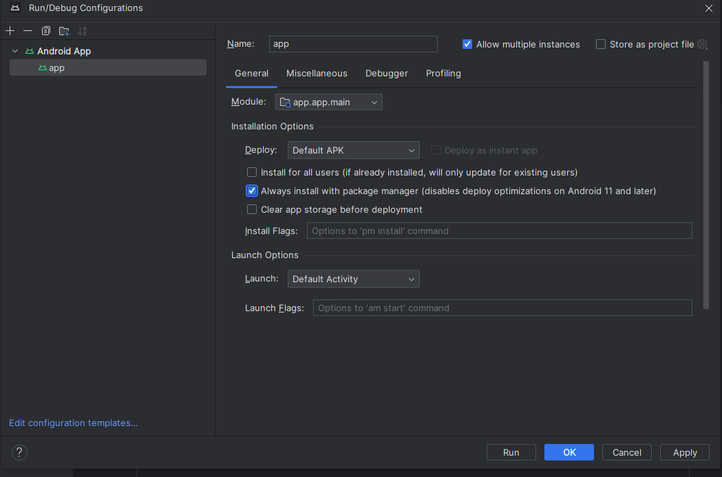 NameNotFoundException 발생 시, Run/Debug Configurations 에 Always install with package manager 항목을 활성화 시켜준다.
