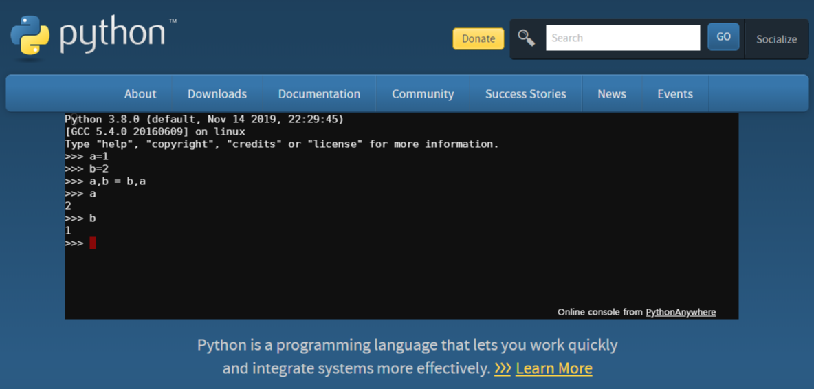 https://www.python.org/ 파이썬 공식 홈페이지에서 pythonanywhere 으로 부터 제공 받은 온라인 콘솔을 제공한다.