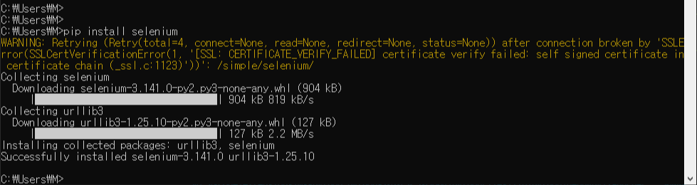 cmd 창에서 수행하였다. 자동으로 selenium 3.141 버젼이 설치 된다.