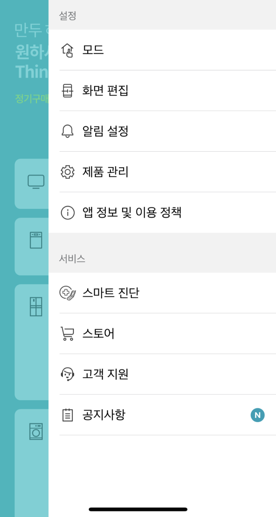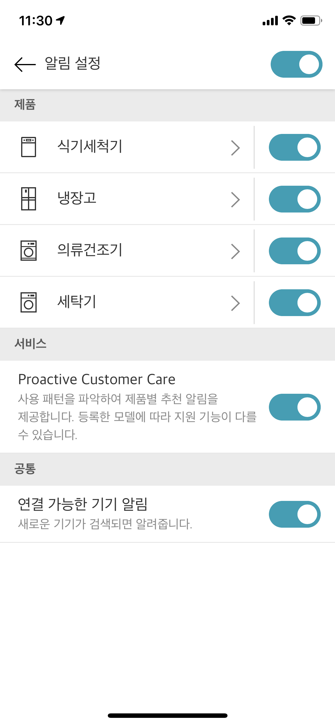 LG ThinQ 앱은 자체적으로 알림 설정을 끄고 키는 메뉴를 제공한다.