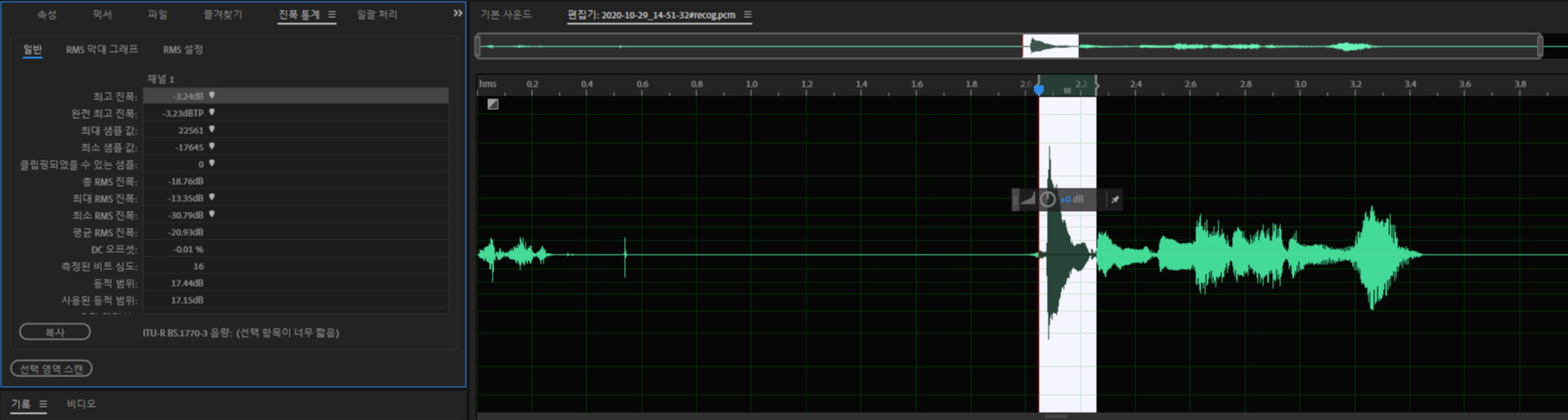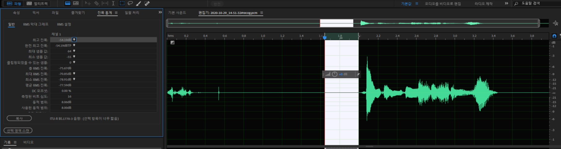 무음 구간에서의 파형이 일정하기 때문에 실제 무음이 굉장히 저하된 상태임을 확인 할 수 있었다.
