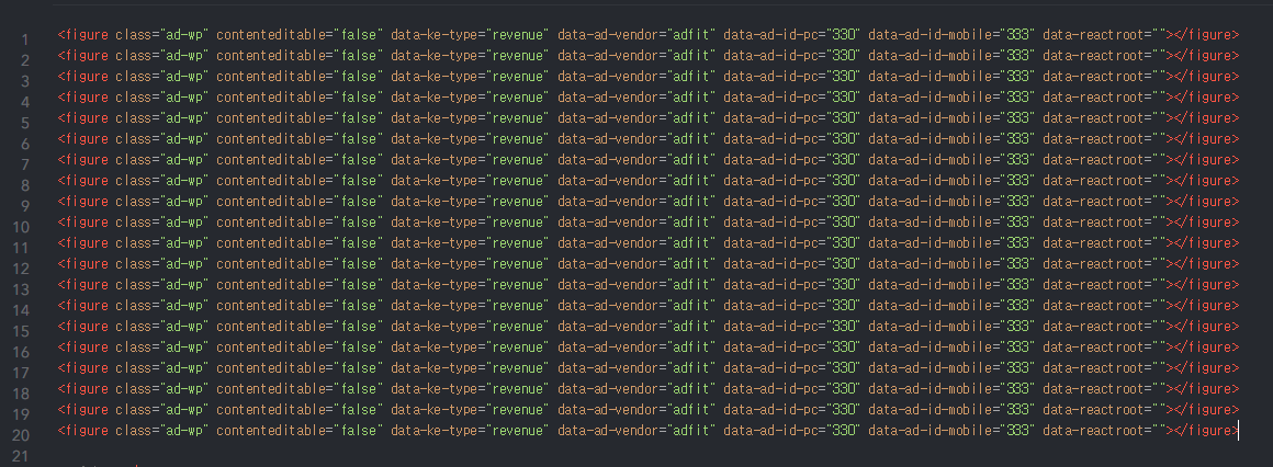 이렇게 하면 본문 글에 광고가 무한대로 작성이 가능하다. 아래 사진 처럼 실제 글 페이지에서도 광고가 수십개 보이는것이 확인된다.