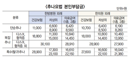 치료하는 방법에 대해서 가격 또한 무시못할 고려 대상이다. 추나요법은 대략 2~3만원 정도의 본인 부담금을 형성하고 다. 한의원에 가면 추나만 하는게 아니라 침치료 물리치료등도 하고 하면 대략 3~5만원 정도 계산하는것 같다. 하지만 해당 치료가 실비보험, 건강보험 급여 항목으로 처리되다보니, 실비보험이 있다면 가격적인 문제는 크게 신경쓰지 않아도 된다.