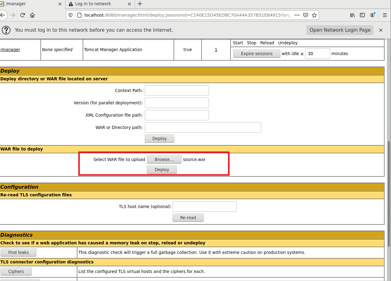 해당 페이지에서, WAR file to deploy 메뉴를 찾고, Select WAR File to upload 에서 opengrok의 source.war 파일을 찾아 deploy 해준다. source.war 파일은 opengrok/dist/lib/source.war 에 있다.